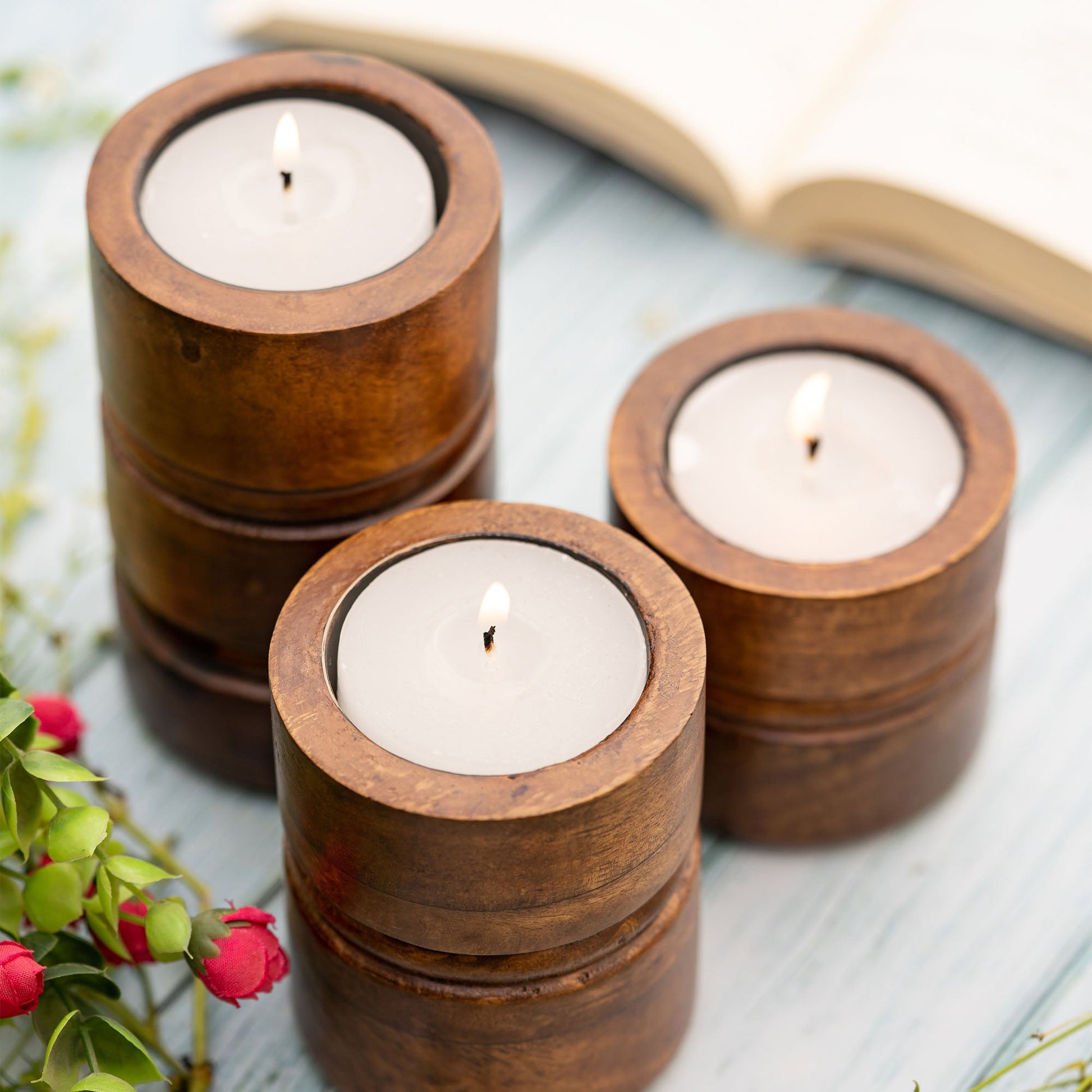 Each holder features the same hand-turned cylindrical form with a recessed tealight well and a ribbed mid-section band, but in the walnut finish the overall effect is warmer, moodier, and more romantic perfect for intimate dining settings, bedroom styling, and occasion tablescapes where the depth of tone adds a sense of occasion and warmth.