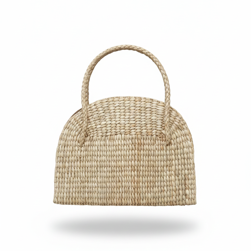 Features a long, sturdy braided strap for effortless hands-free wear. Made from 100% renewable and biodegradable natural grass, offering a plastic-free alternative to traditional small handbags.