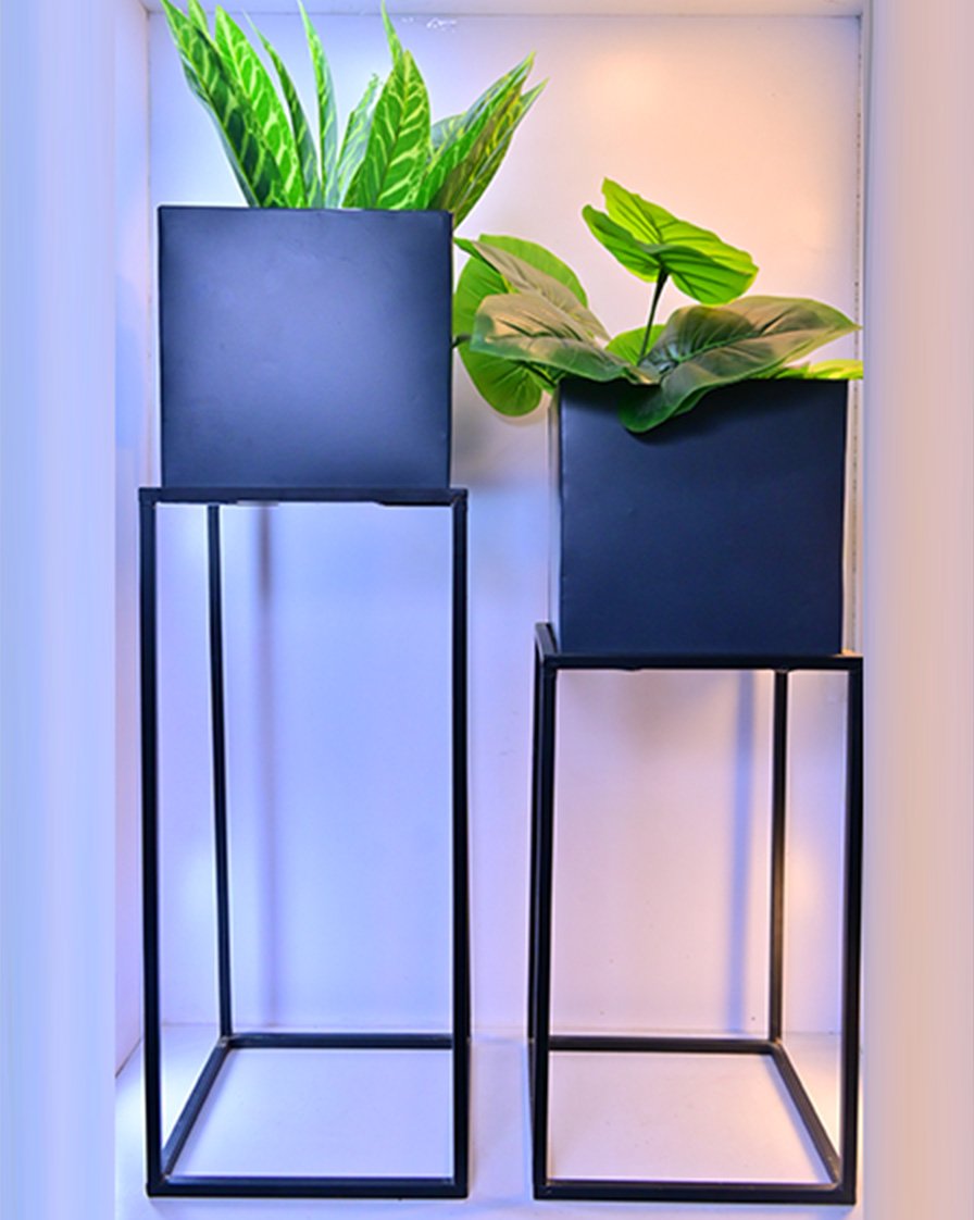 Bring a modern edge to your greenery with the Square Planters on Metal Stands. This Set of 2 planters features clean-lined square pots resting on sleek metal stands at heights of 25.2 inches and 18.90 inches. Perfect for living rooms, offices, and entryways, these metal planter stands create a stylish layered look for your favorite indoor plants.